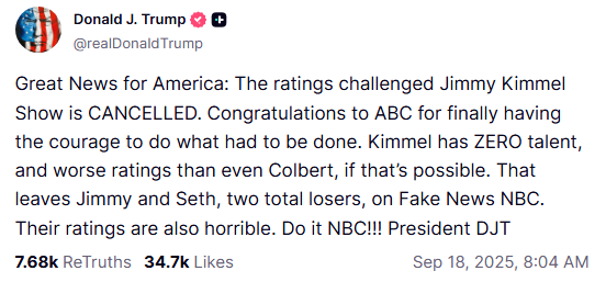 特朗普17日在社交媒体平台“真实社交”上对ABC的停播决定表示肯定:“这对美国来说是个好消息。祝贺ABC终于鼓起勇气做了该做的事”。他同时抨击美国全国广播公司(NBC)脱口秀节目主持人吉米·法伦和塞思·迈耶斯。