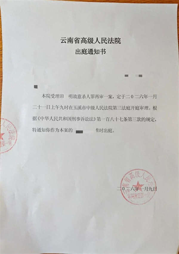 此前,玉溪市中级人民法院一审以故意杀人罪判处田某明死刑,缓期二年执行,剥夺政治权利终身。田某明不服,提出上诉。云南省高级人民法院二审裁定驳回上诉、维持原判,并核准田某明死刑,缓期二年执行,剥夺政治权利终身。