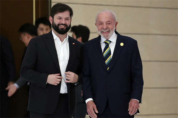 2025年5月13日,中国北京,巴西总统卢拉(右)与智利总统鲍里奇在中国CELAC论坛部长会议开幕式前聊天,准备合影。 视觉中国