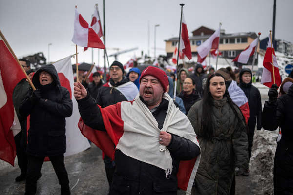 当地时间2026年1月17日,格陵兰岛首府努克,当地民众举行抗议活动,反对美国近期持续威胁要“接管”格陵兰岛,呼吁允许其自主决定未来。 IC photo