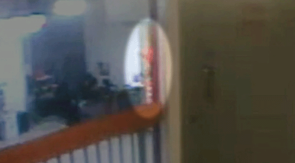 被放大的监控画面显示,通往爱泼斯坦囚室所在监区的楼梯上,出现一个橙色物体的局部影像。 视频截图