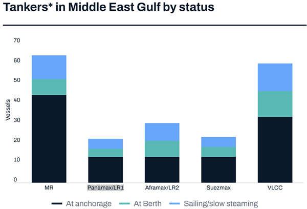其中,超大型原油运输船(VLCC)拥堵最为严重:海湾内60艘VLCC中,13艘靠泊装货、33艘抛锚待泊、14艘低速航行,船东与租家均在商议对策。
