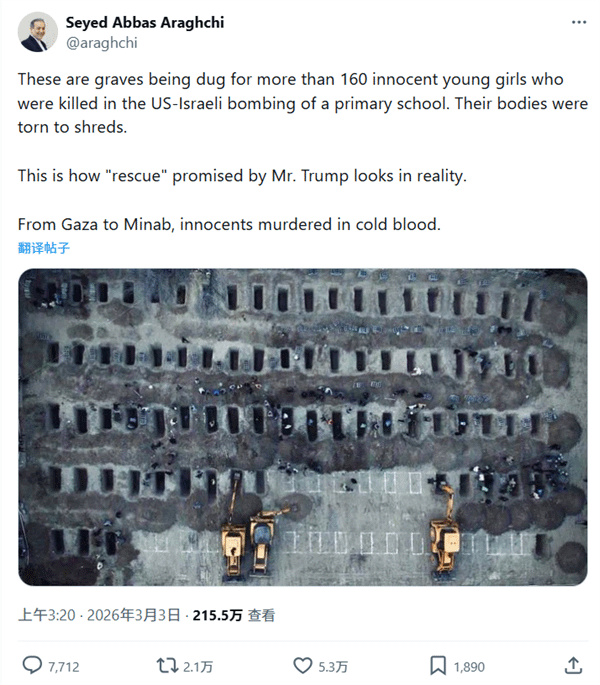 3月2日,伊朗外交部长阿拉格齐在社交平台X上发文,指责美以杀害儿童,并配发了新挖墓穴的照片。