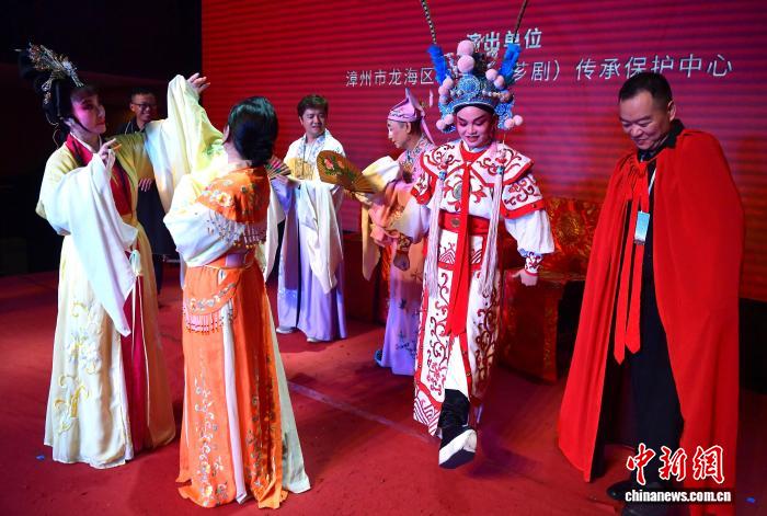 9月10日,“行走中国·2025海外华文媒体漳州行”活动走进福建漳州市龙海区参访,图为一行人体验当地戏剧芗剧。中新网记者 张斌 摄