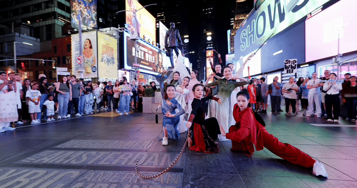 近日,“魅力河北”主题快闪活动在纽约时代广场精彩上演,吸引了众多市民与游客驻足观看。(艾景新 摄)