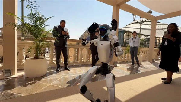 第九届沙特阿拉伯“未来投资倡议”大会27日在沙特首都利雅得开幕。来自杭州宇树科技的G1人形机器人“奔奔”在大会中惊艳登场。身高约132厘米、体重约35公斤的“奔奔”,身姿灵动,动作精准,展现出超强的灵活性与科技感。每当它登台展示技能,都会吸引大量参会者的关注。