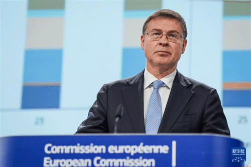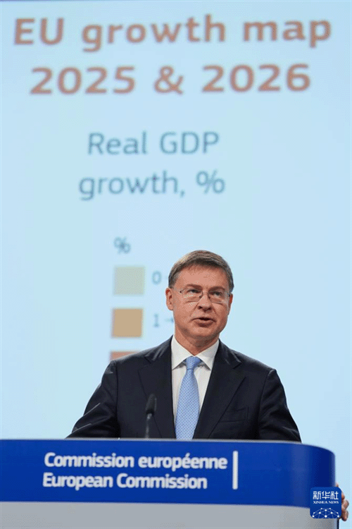 11月17日,欧盟委员会负责经济事务的委员东布罗夫斯基斯在比利时布鲁塞尔发布2025年秋季经济展望报告。新华社记者 彭子洋 摄