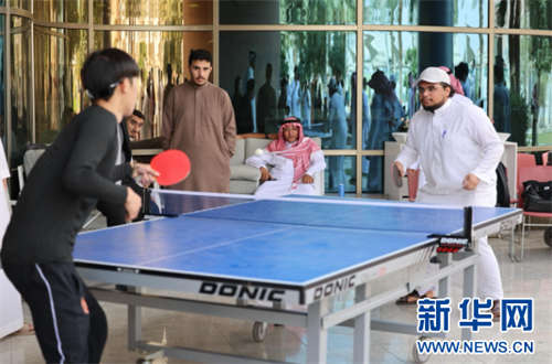 11月16日,中国和沙特学生在沙特苏尔坦亲王大学校园内举行的中沙青年文化交流活动上打乒乓球。记者 罗晨 摄