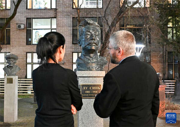 12月5日,在俄罗斯首都莫斯科全俄外国文学国家图书馆,人们驻足观看鲁迅铜像。新华社记者 郝建伟 摄