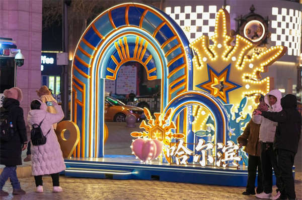 人们在哈尔滨市中央大街上的一处景观前拍照(2025年12月16日摄)。新华社记者 王松 摄