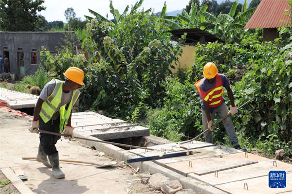 1月21日,在卢旺达北方省布雷拉地区,两名当地工人在由中国路桥和卢本土企业组成的联营体承建的道路升级项目上进行盖板铺装。