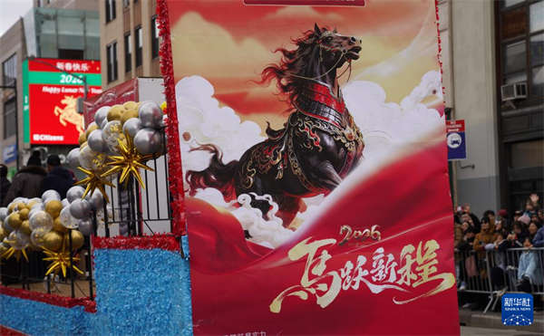 这是2月21日在美国纽约拍摄的以中国农历马年为主题的花车。