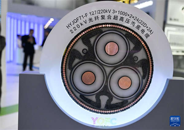 这是3月2日在西班牙巴塞罗那举办的世界移动通信大会上拍摄的长飞光纤生产的光纤复合超高压海底电缆。