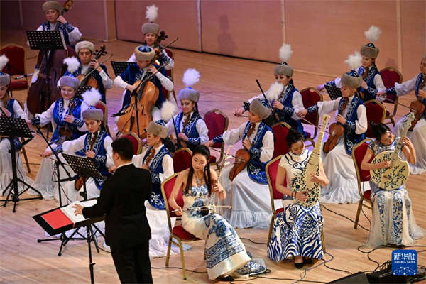 3月5日,在位于阿拉木图的哈萨克斯坦国立江布尔音乐厅,“青花瓷”民乐团和哈萨克斯坦特连迪耶夫模范民族乐团同台演奏。