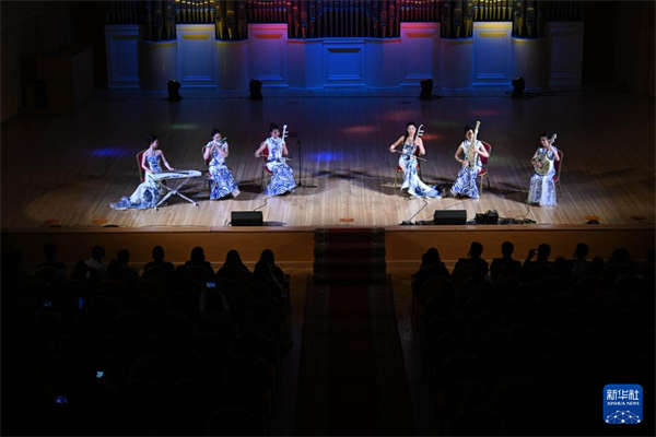 3月5日,在位于阿拉木图的哈萨克斯坦国立江布尔音乐厅,“青花瓷”民乐团演奏中国民乐。