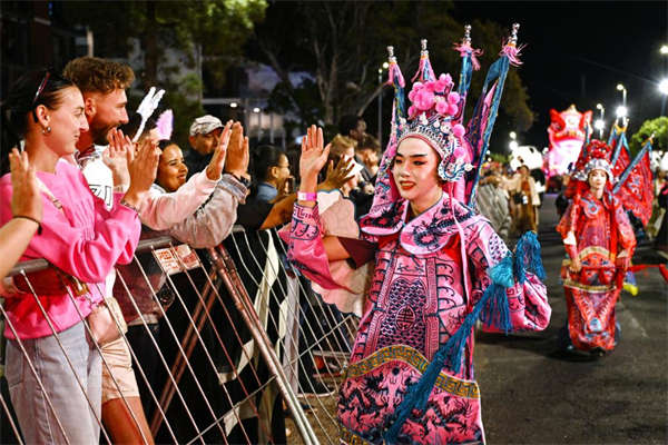 3月21日,在南非开普敦,中国方阵的表演者在开普敦狂欢节游行上与观众互动。新华社发(哈比索·姆卡贝拉摄)