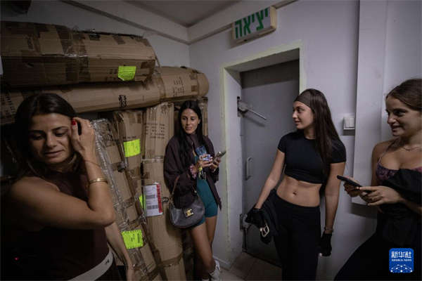 3月26日,在以色列特拉维夫,防空警报响起后,练习瑜伽的女孩们停止运动,进入社区的地下民防设施避难。