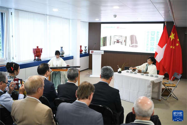 8月22日,在瑞士伯尔尼中国文化中心,嘉宾在 “安善萃锦——中式生活美学展”开幕式上观看表演。