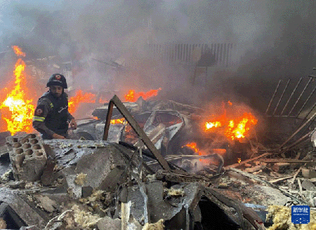 4月8日,救援人员在黎巴嫩首都贝鲁特扑救以色列空袭引发的火灾(手机照片)。新华社发(比拉尔·贾维希摄)