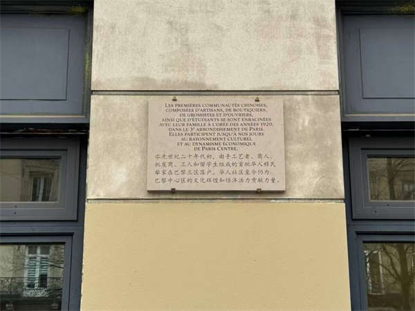 “20世纪20年代初,由手工艺者、商人、批发商、工人和留学生组成的首批华人移民举家在巴黎三区落户。华人社区至今仍为巴黎中心区的文化辉煌和经济活力贡献力量。”这块悬挂于历史建筑墙面的中法双语纪念牌记录着中国人在法国社会发展中的痕迹。
