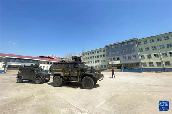 4月14日,在土耳其东南部尚勒乌尔法省的一所中学,警方调派装甲车辆加强保卫。新华社发(穆斯塔法·卡亚摄)