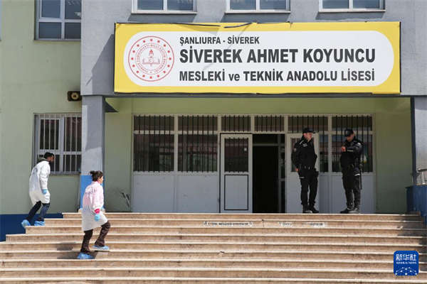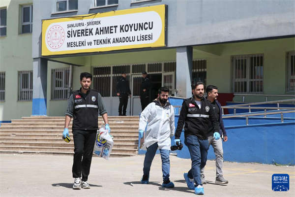 4月14日,在土耳其东南部尚勒乌尔法省的一所中学,警方派出的技术人员对枪击事件现场进行勘查。新华社发(穆斯塔法·卡亚摄)