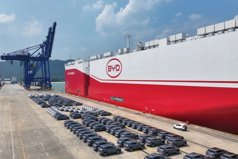 2025年7月8日,广东汕尾,深汕特别合作区,比亚迪“深圳号”滚装船在深圳小漠国际物流港装载新能源汽车。 IC Photo