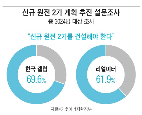 关于推进新建两座核电站计划的问卷调查,韩国两家民意调查机构得出的结果是:认为应该新建的人占比为69.6%和61.9%