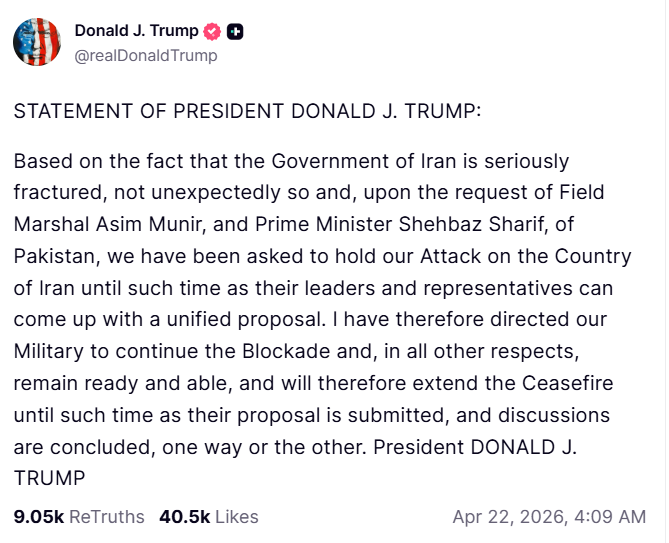 唐纳德·J·特朗普总统声明:伊朗政府目前已陷入严重分裂,这一点并未出乎预料。应巴基斯坦陆军参谋长穆尼尔元帅与夏巴兹·谢里夫总理的请求,美方暂缓对伊朗发起打击,直至其领导层与代表方能够拿出统一的方案。据此,我已指示美军继续维持封锁,并在其他各方面保持高度戒备与作战能力。现决定延长停火,直至伊朗提交相关方案、相关谈判无论以何种方式结束为止。——唐纳德·J·特朗普总统