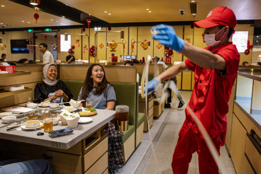 雅加达的一家海底捞庆生。在这家火锅店,员工常常会表演拉面舞蹈。 《纽约时报》配图