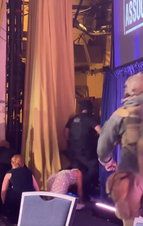 这段画面中,身穿亮银色礼裙的姜伟嘉紧紧跟着保护特朗普的特勤人员,想要一同撤离,不料此时特勤人员出于安全考虑要求特朗普跪倒在地,因此突然停下了脚步,这让姜伟嘉和他们撞了个满怀。此后,狼狈跪地的特朗普重新站起身撤离,姜伟嘉此时为确保自身安全也已跪在地上,慢慢爬行着撤离到后台区域。