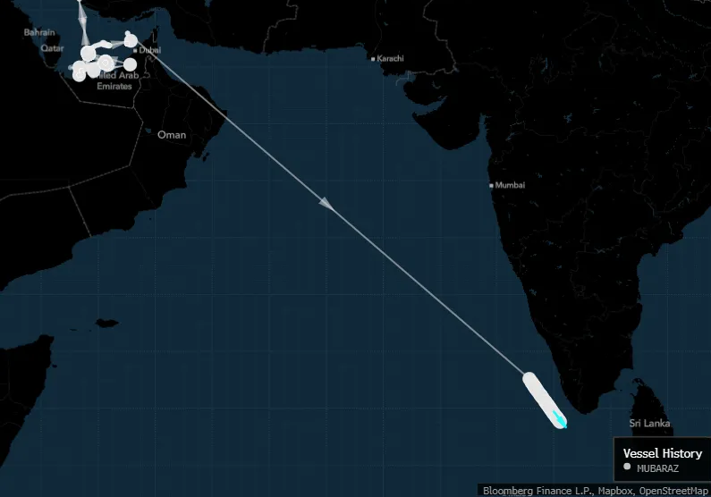 船舶追踪数据显示,“穆巴拉兹”号(Mubaraz)运输船于三月初在阿联酋阿布扎比国家石油公司达斯岛完成装货,目前正航行至印度南端海域。