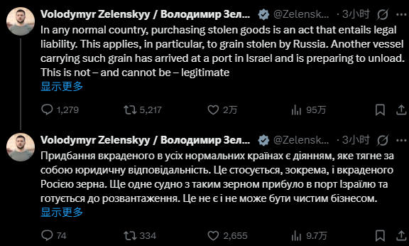 乌克兰总统泽连斯基28日称,以色列购买来自俄占乌克兰领土的粮食,“绝非合法的商业行为”。