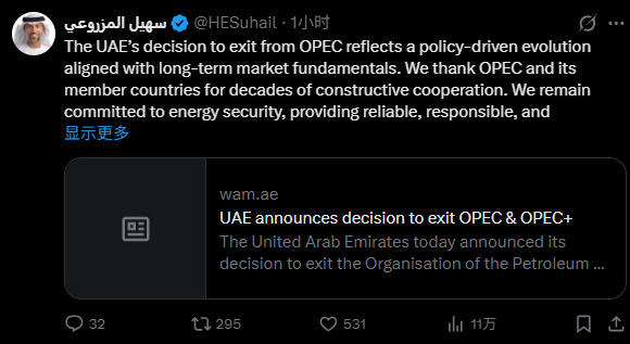 28日,阿联酋能源大臣苏海尔·马兹鲁伊在社交媒体X平台发布声明称:“阿联酋退出OPEC的决定,反映了与长期市场基本面相一致的政策驱动演变。我们继续致力于能源安全,提供可靠、负责任且低碳的供应,同时支持全球市场的稳定。”