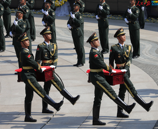 9月13日上午,第十二批在韩中国人民志愿军烈士遗骸安葬仪式在沈阳抗美援朝烈士陵园举行。礼兵们迈着整齐的步伐,护送志愿军烈士遗骸棺椁缓步进入纪念广场。(海外网 王陈逍遥/摄)