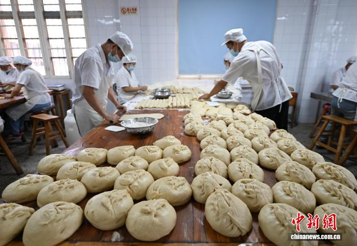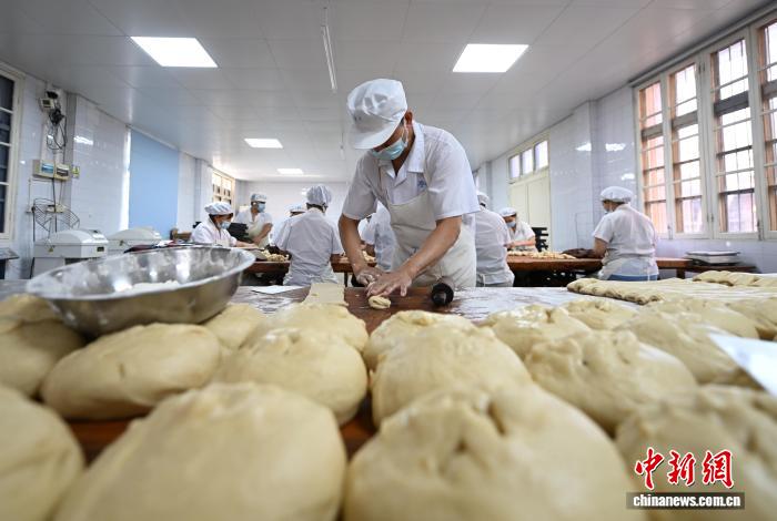 9月19日,工作人员制作月饼面团。随着中国传统中秋佳节渐近,浙江杭州临平亭趾月饼受到消费者青睐,工人们加班制作,每天生产7万多个月饼发往各地,供应中秋订单高峰。据了解亭趾月饼已传承数十年,其以传统的手工制作技艺和酥香口感吸引国内消费者和海外华侨华人。中新社记者 王刚 摄