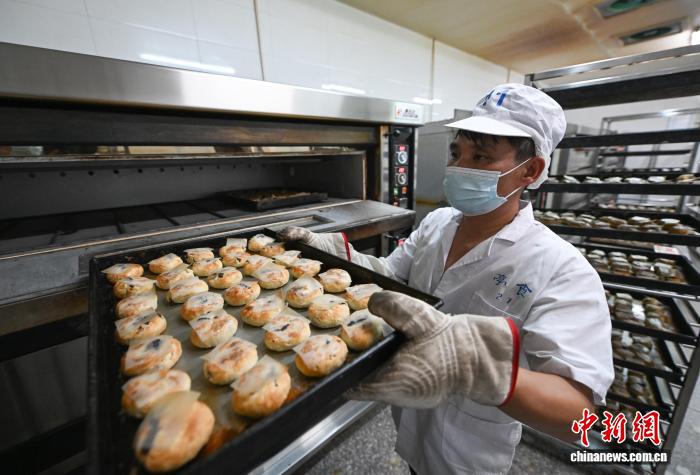 9月19日,工作人员拿出烤熟的手工月饼。随着中国传统中秋佳节渐近,浙江杭州临平亭趾月饼受到消费者青睐,工人们加班制作,每天生产7万多个月饼发往各地,供应中秋订单高峰。据了解亭趾月饼已传承数十年,其以传统的手工制作技艺和酥香口感吸引国内消费者和海外华侨华人。中新社记者 王刚 摄