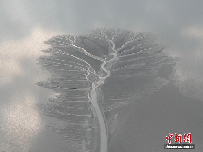 潮汐树是潮水冲刷滩涂形成的天然沟壑系统。要欣赏这巨幅“画作”,必须借助航拍视角俯瞰,拍摄时更要有熟悉潮汐与地形的老手带队。