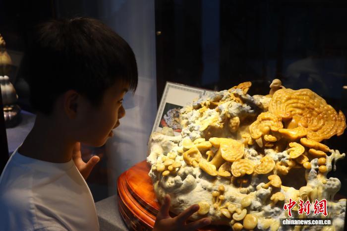 10月4日,浙江青田,作为青田华侨曾经海外赚钱谋生所依托的重要物品,青田石雕吸引游客参观打卡。中新社记者 周健 摄