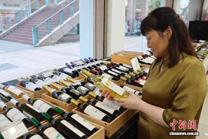 10月4日,浙江青田,游客选购进口红酒。中新社记者 周健 摄
