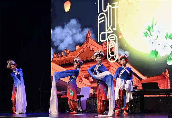 10月8日,在德国柏林,中国驻德国大使邓洪波(中左)、全德华人华侨青年总会会长郑建国(中右)在活动现场与演职人员合影。新华社记者 张豪夫 摄