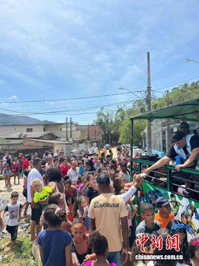 身着华社会服的巴西志愿者为平民社区孩子们派发儿童节礼物。巴西华人慈善公益平台供图