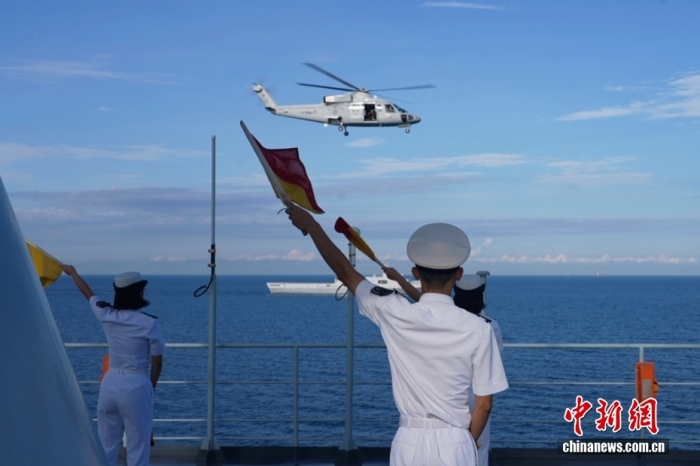 当地时间10月16日上午,中国海军83舰编队抵达泰国梭桃邑港,开始对泰国进行为期4天的友好访问。图为中国海军与泰国海军旗语互致问候。中新社发 中国驻泰国大使馆 供图