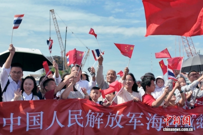 港岸码头,中国驻泰国大使张建卫和使馆人员以及中资机构、华侨华人代表、中泰青年代表、泰国皇家海军等1700余人在码头迎接,并举行隆重的欢迎仪式。当地中小学学生手持中泰两国国旗和中泰友好标语,热烈欢迎中国海军舰艇编队来访。