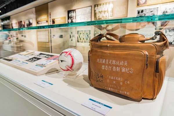 华侨运动员容志行签名足球、签名纪念包等相关展品在广州华侨博物馆“赤子心 体育情——华侨华人与中国体育展”展出。受访者供图