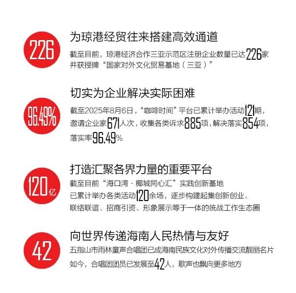 “海口湾·椰城同心汇”新的社会阶层人士统战工作实践创新基地成为统战新力量聚集地,五指山市雨林童声合唱团以天籁之音向世界传递海南人民的热情与友好,三亚吸引全球华商深耕热土,保亭则以一杯咖啡“喝”出营商新生态。这些生动实践,不仅是海南推进高水平对外开放的缩影,更是凝聚共识、汇聚合力,助力自贸港建设跑出“加速度”的温暖注脚。
