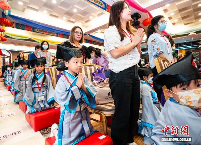 2023年10月15日,香港特区啬色园黄大仙祠举行2023年儿童启蒙开笔礼仪式,约150名儿童通过敬拜、开笔、点朱砂等仪式环节学习中国传统读书做人的道理。中新社记者 侯宇 摄