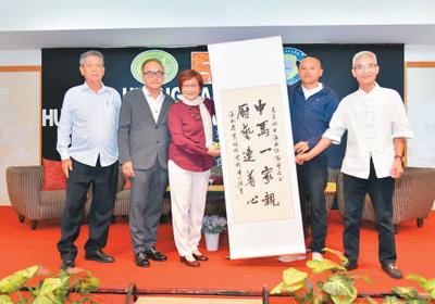 林秋雅(左三)代表马来西亚海南总商会接过海南省烹饪协会赠送的书法作品。