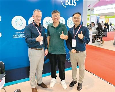 图为2025年6月,王思维(中)与新西兰一家口腔益生菌品牌的合作伙伴在上海参加行业展会。受访者供图