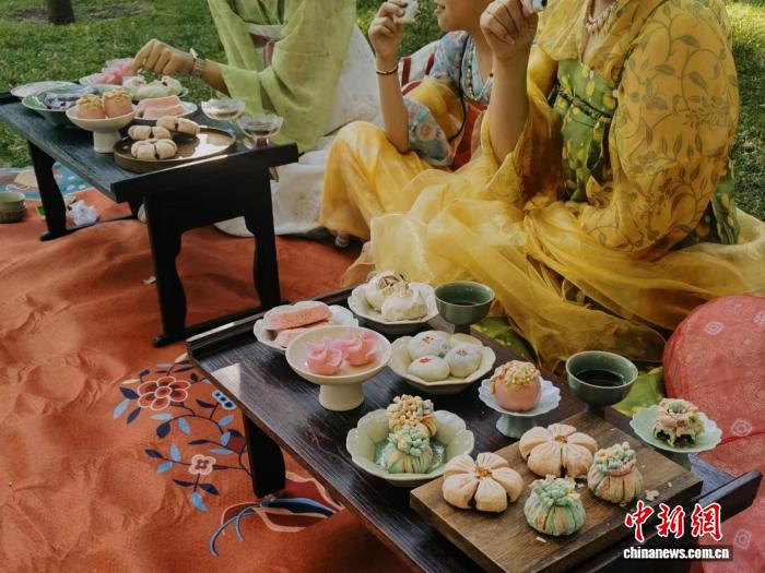 中式点心也融入宴会茶歇、文化雅集等多元场景。倪明茜说:“我们经常受邀为婚宴、会议等做茶歇点心,惟妙惟肖的花酥总能让点心摆台变成拍照打卡点。我们还举办裙幄宴等活动,大家身着汉服,围坐草地上,品茗茶吃点心,享受自然野趣与中式雅致的时光。最近我们还参与了在马德里皇宫区拉索街举行的一场集市,山楂锅盔、绿豆桂花饼等中式点心吸引了市民与游客驻足品尝。”